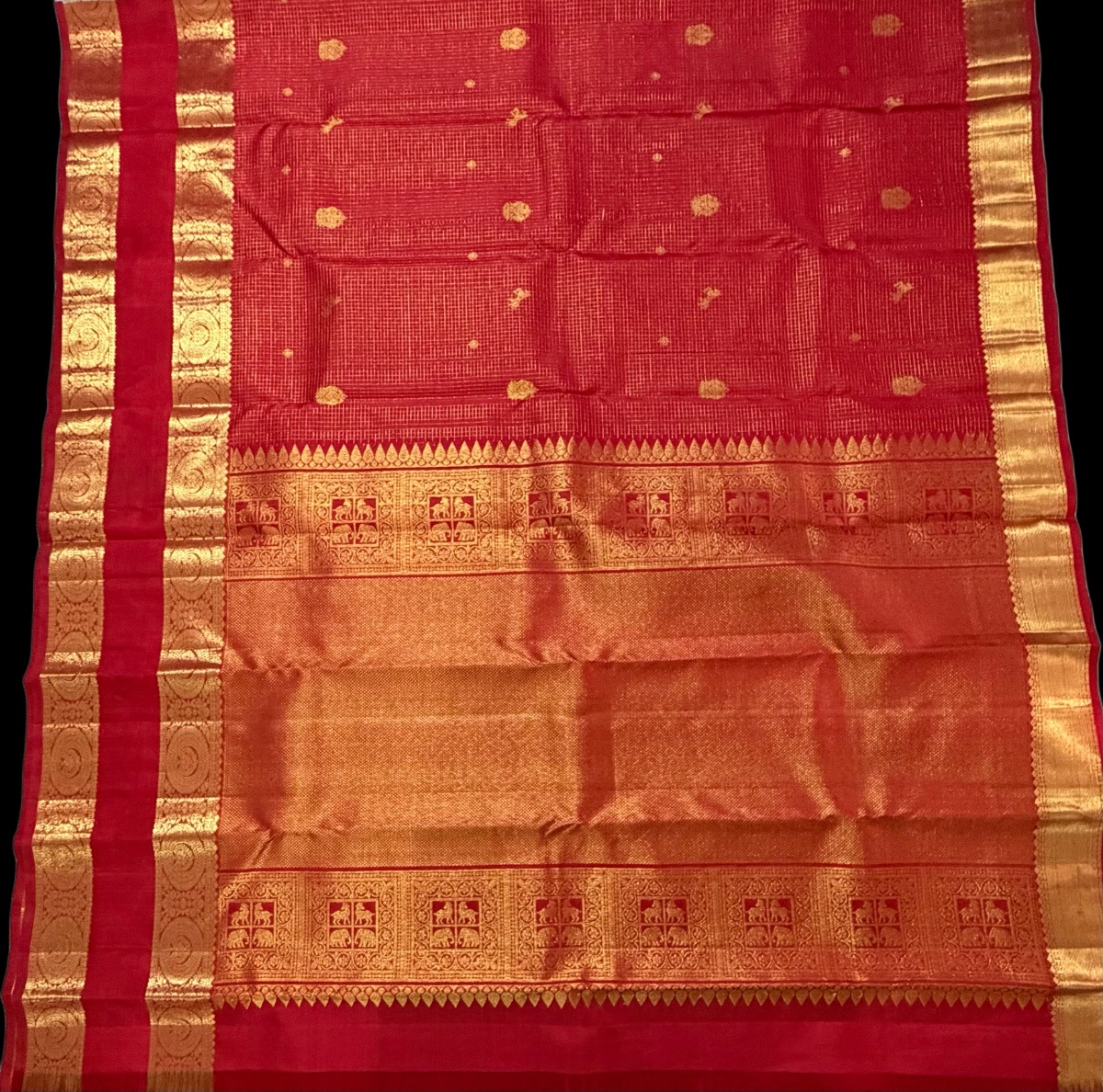 * Pallu: Rich Gold Zari Pallu with Temple Inspired Designs (Kanthaka, Elephant & Flower Buttas)