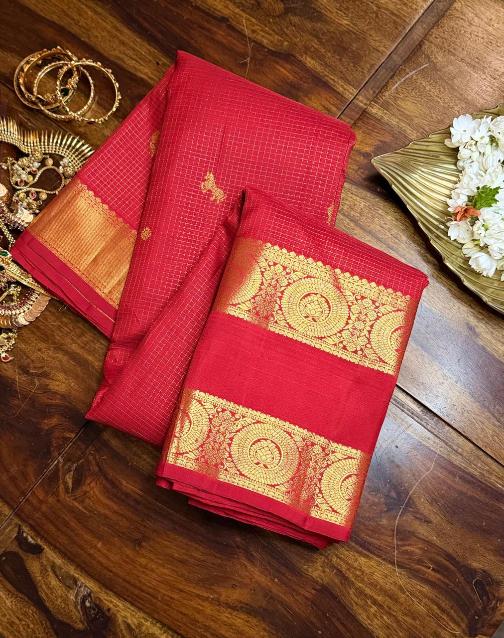 * Body Design: Gandaberunda, Flower & Kanthaka ( Royal Horse) Zari Buttas with Subtle Grid Pattern