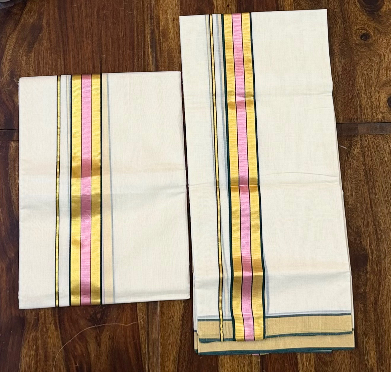 - Kara: Approximately 2-Inch Pure Kasavu (Zari) Kara / Border with Green & Pink Temple Lines