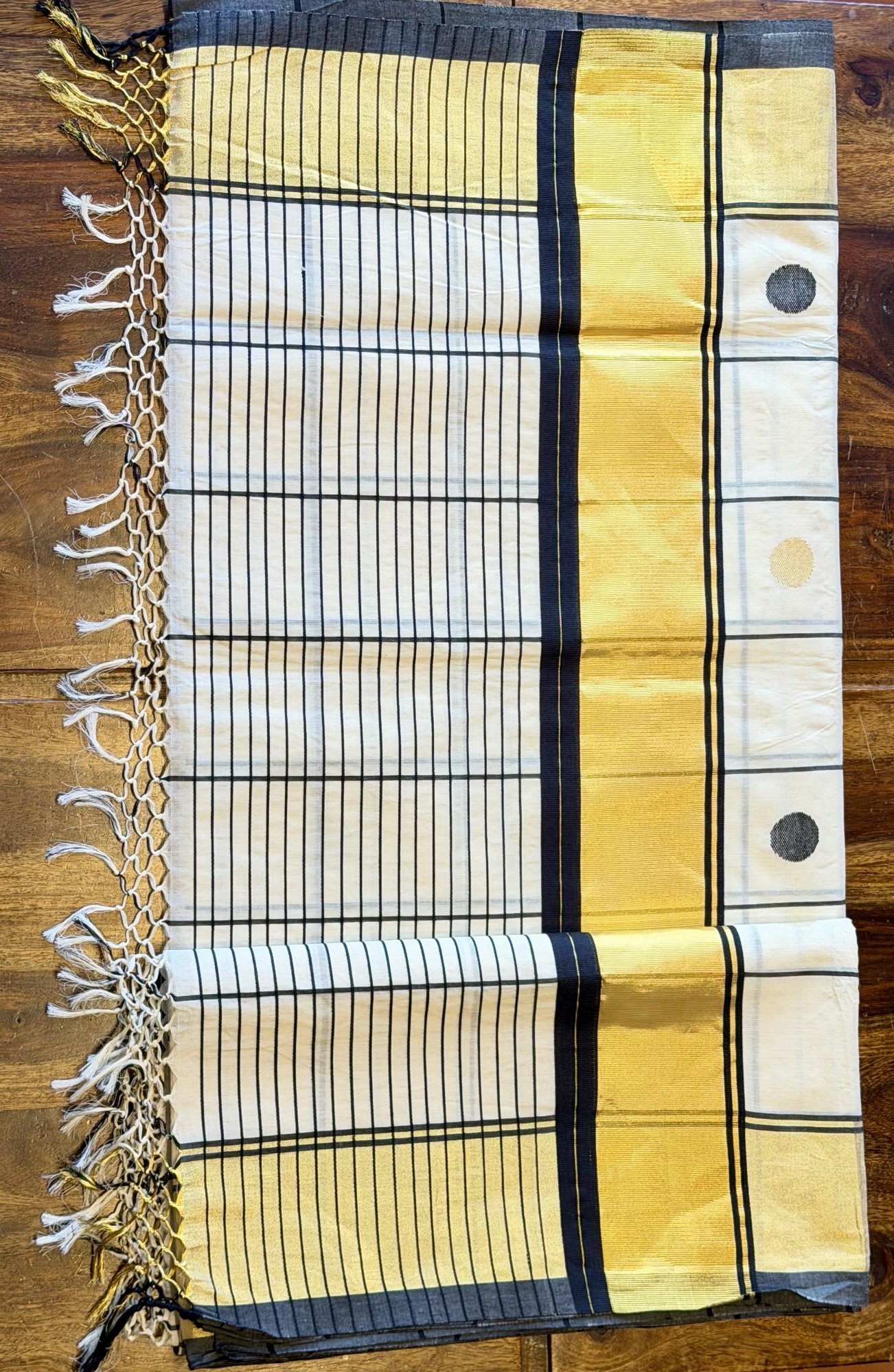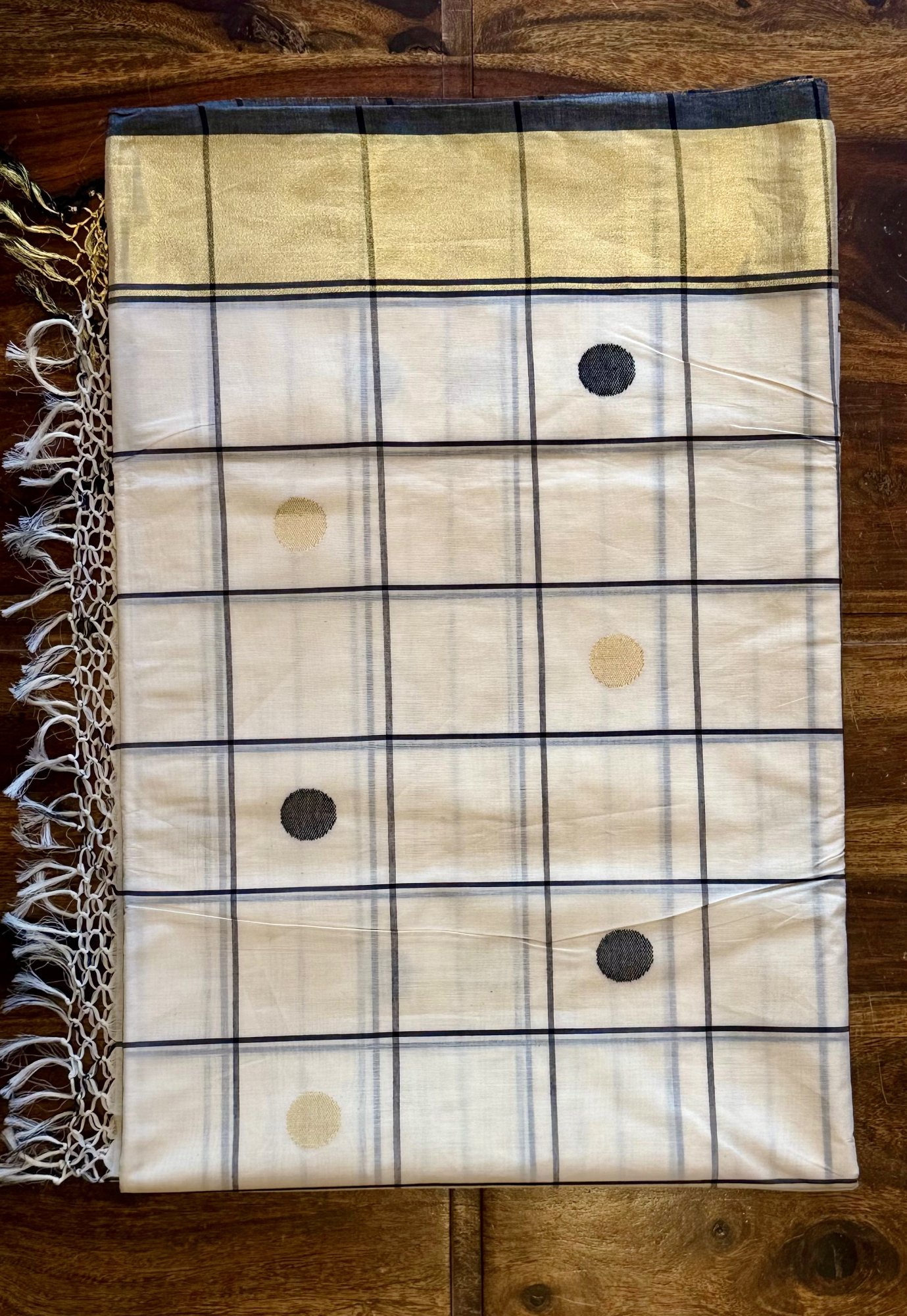 Kerala Kasavu Saree with Black & Gold Polka Dots and Classic Kasavu Border