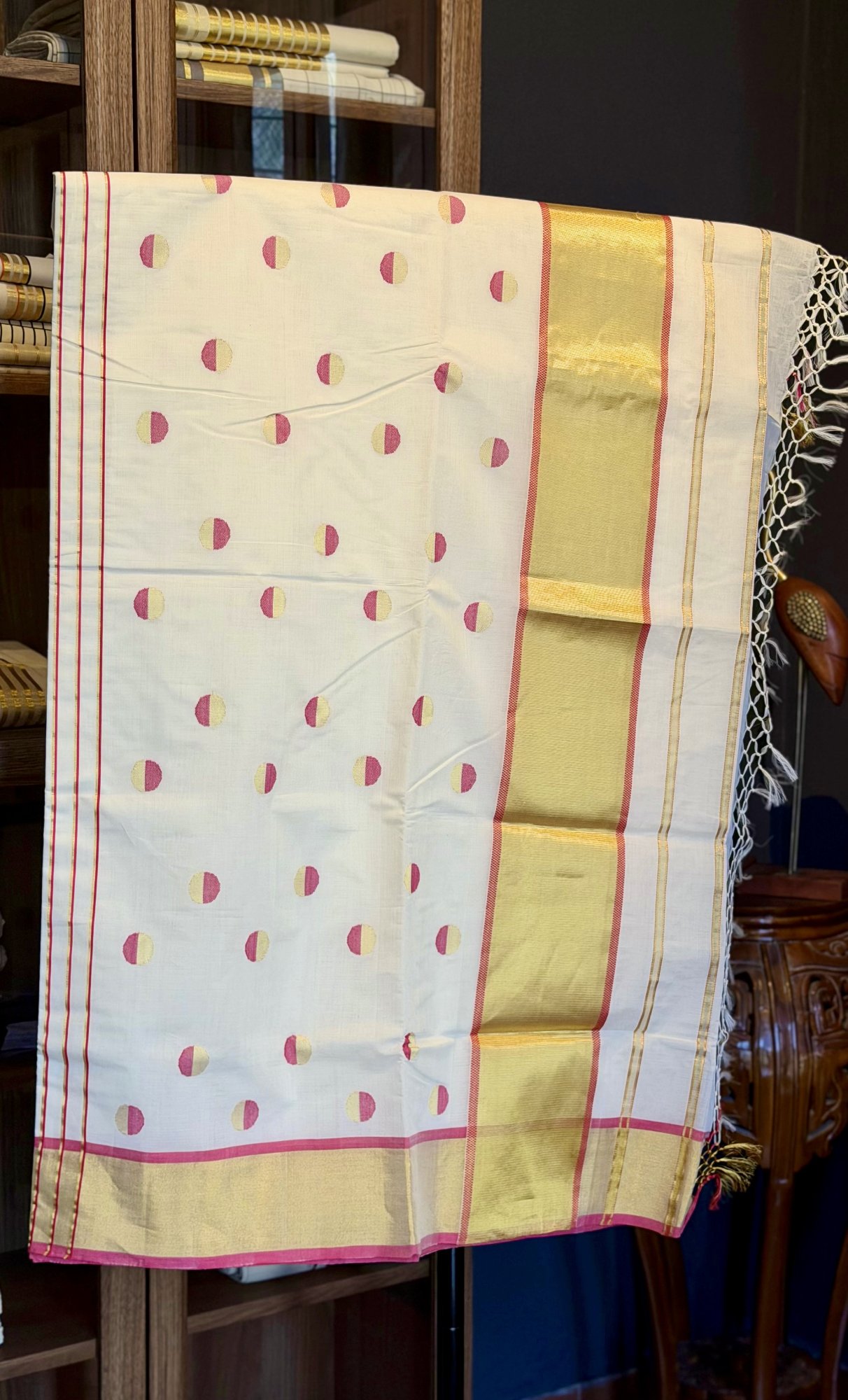Kerala Kasavu Saree with Pink Polka Dots & Gold Kasavu Border