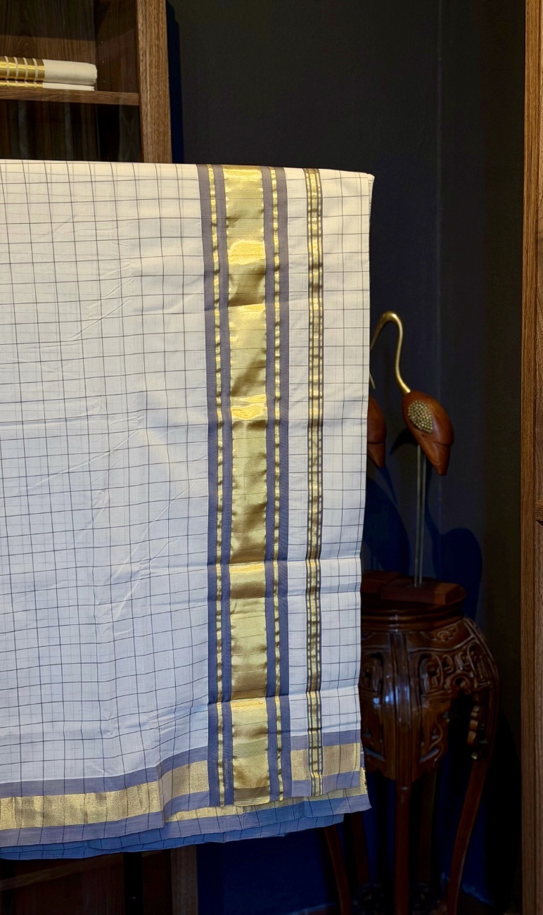 • Border: Approx. 3.5-Inch Gold Kasavu with Grey Line Combination