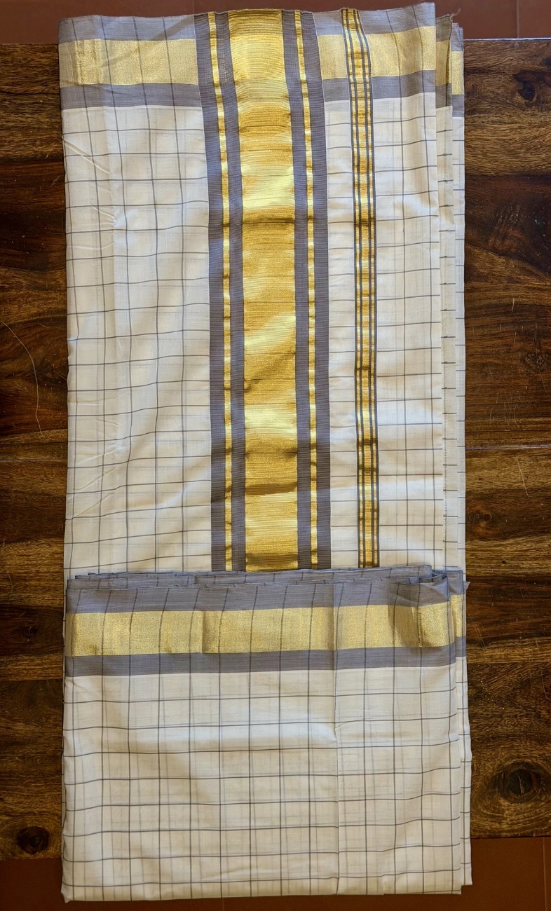 Pure Handloom Kerala Kasavu Saree with Grey Check Pattern and Classic Kasavu Border