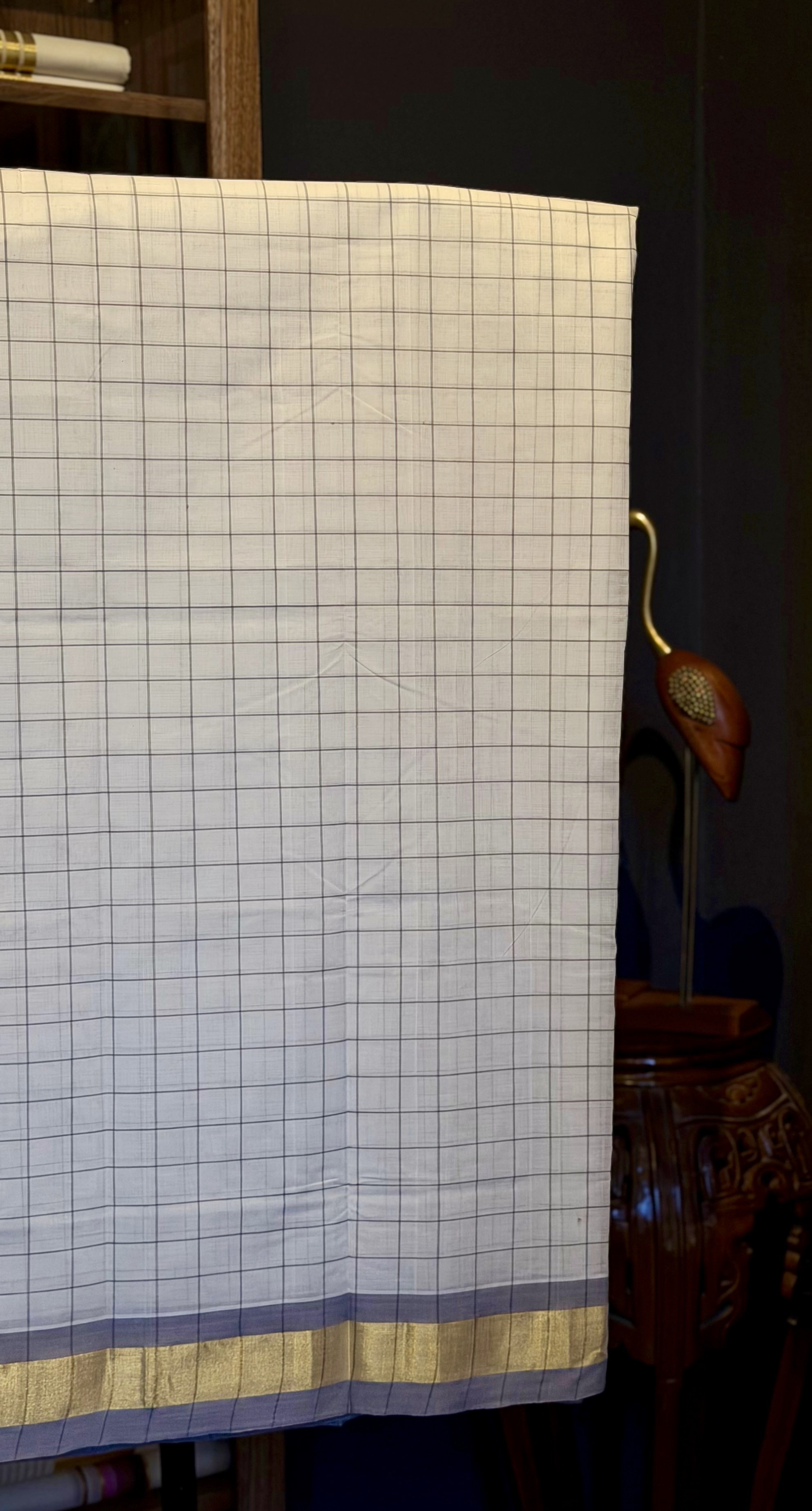 The saree body features a refined grey check pattern gracefully spread across the natural off-white cotton base, creating a sophisticated geometric design that blends classic Kerala aesthetics with understated contemporary elegance. The subtle grey lines bring depth and structure to the saree while maintaining the purity and simplicity that characterise traditional Kasavu drapes.