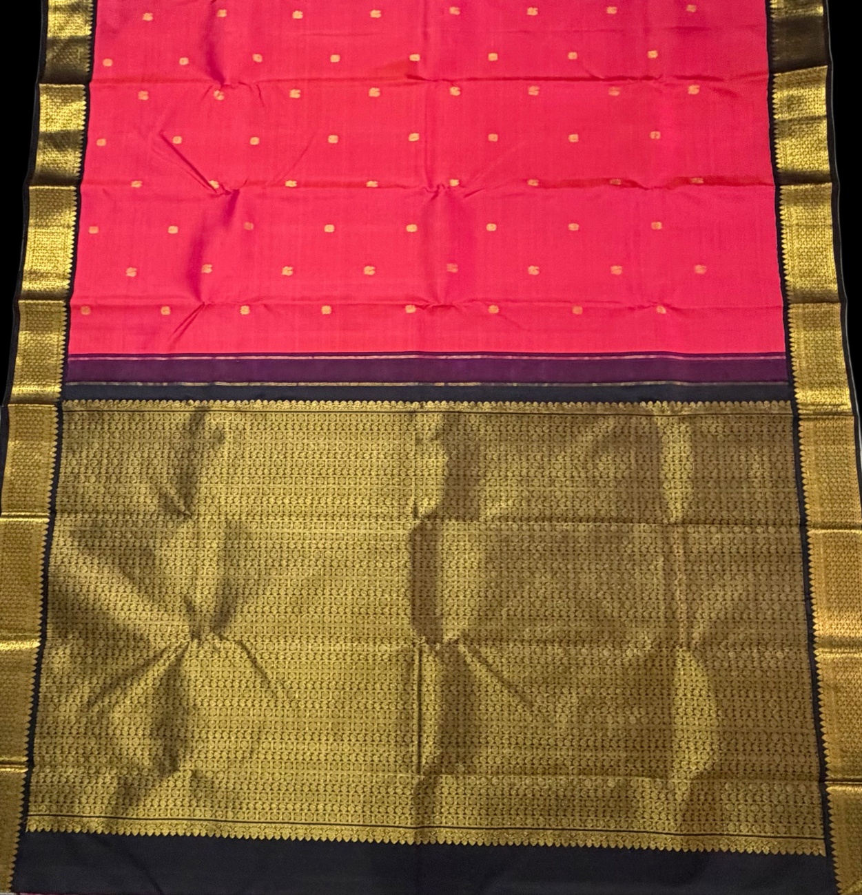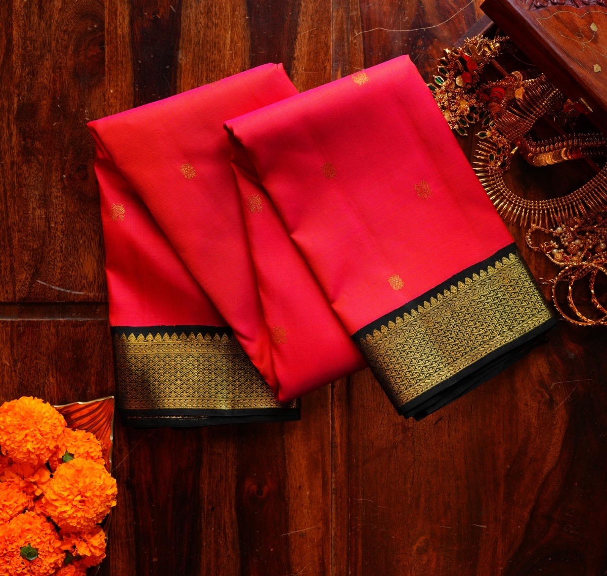 Woven from premium mulberry silk, this saree offers a smooth texture, elegant drape, and a rich natural sheen. The combination of vibrant coral pink with deep black contrast and gold zari creates a sophisticated look that is perfect for weddings, festive celebrations, temple occasions, and traditional ceremonies.