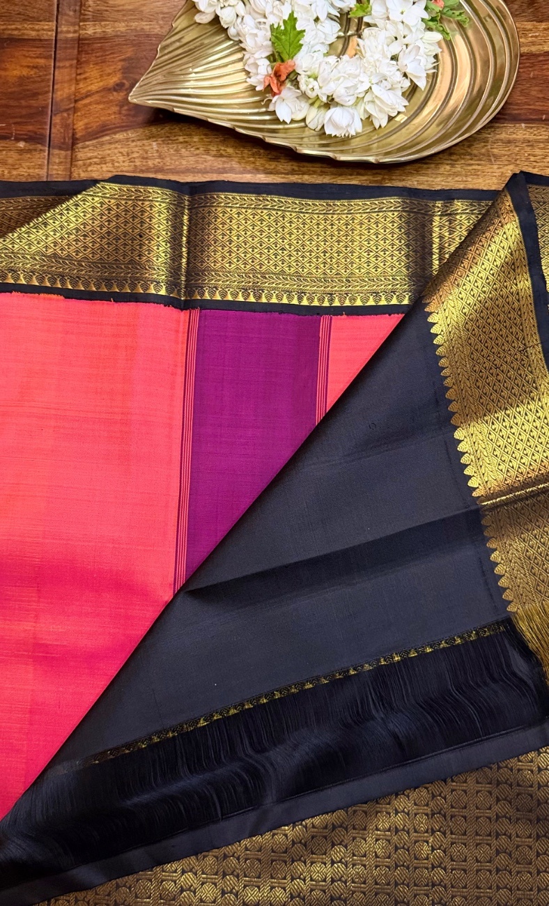 Pure Kanchipuram Silk Saree in Coral Pink Dual Tone with Contrast Black Zari Border