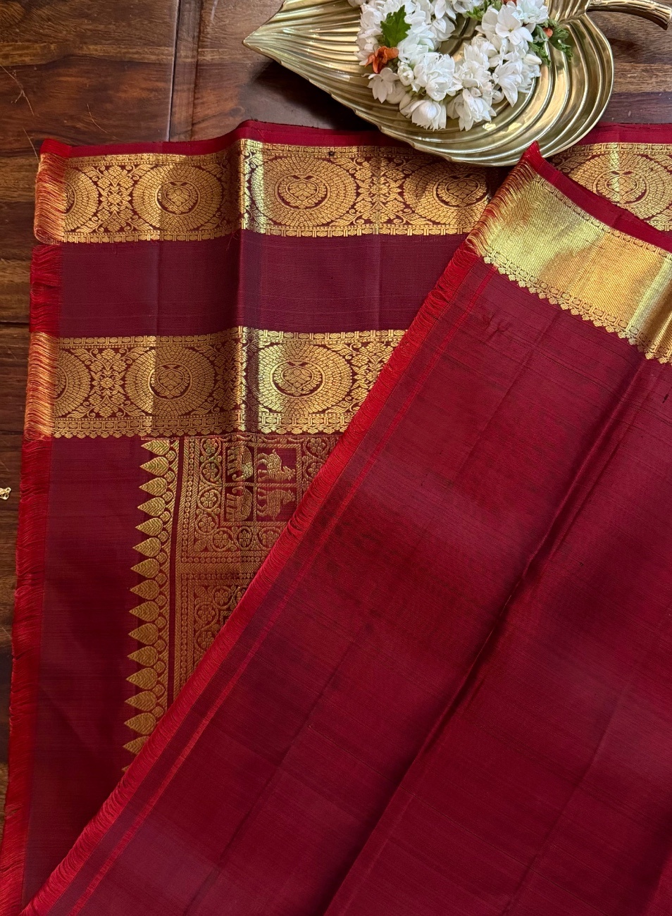 Temple Maroon Pure Kanchipuram Silk Saree with Traditional Zari Border