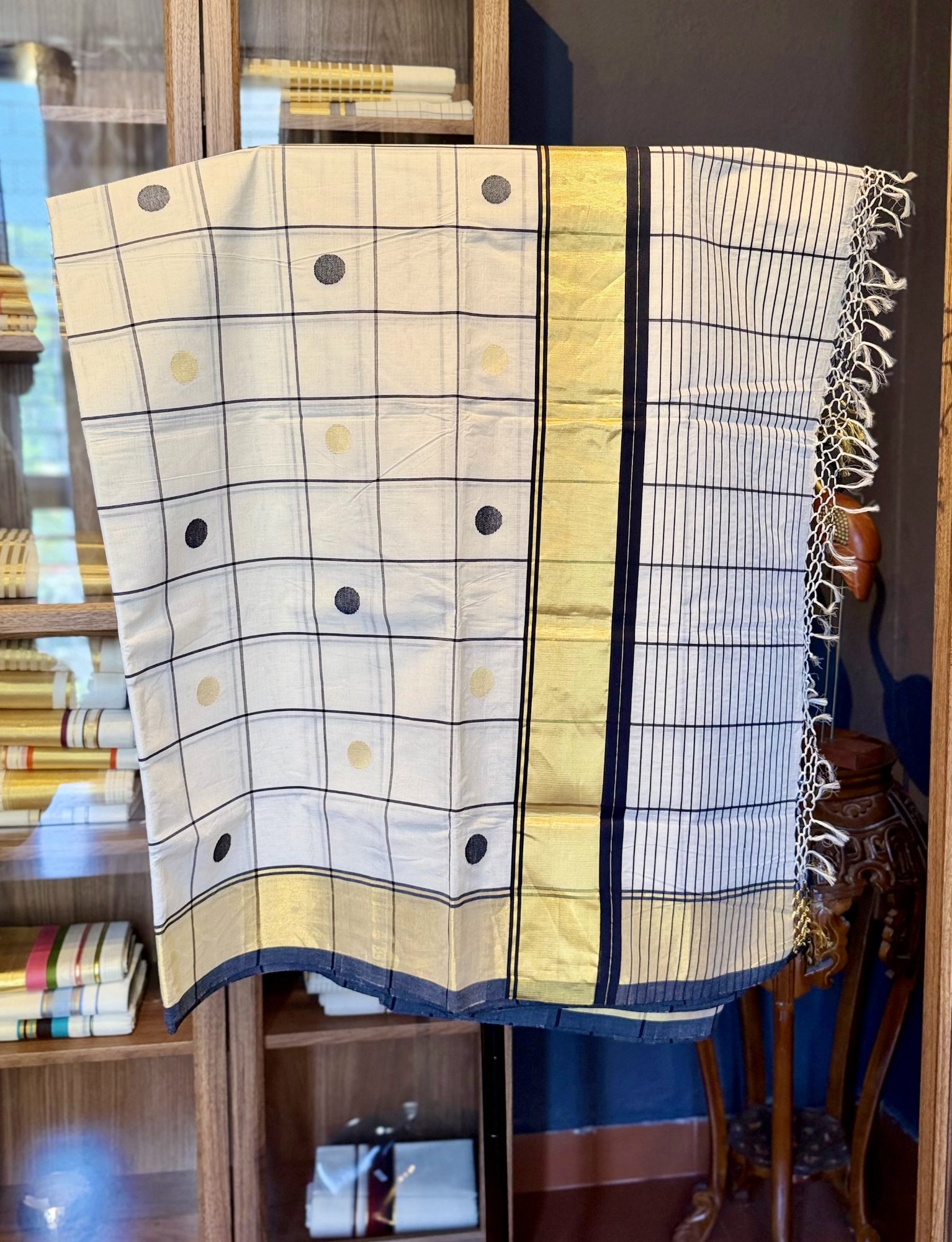 Kerala Kasavu Saree with Black & Gold Polka Dots and Classic Kasavu Border
